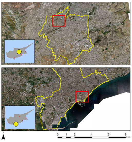 The municipalities of Strovolos (top) and Limassol (bottom) in Cyprus, selected as case studies. Red polygons include specific historic buildings under investigation here.