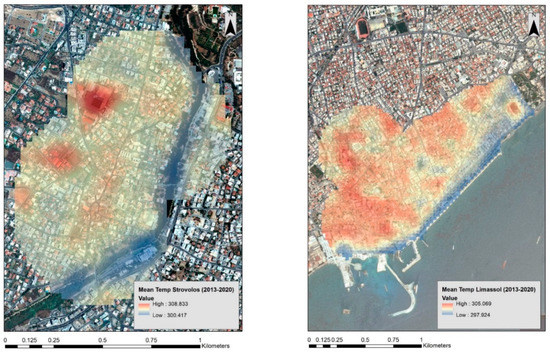 All data were then imported into the ArcGIS environment to visualise the results and to apply spatial analysis. Figure 4 (left) shows the mean temperature results for the period 2013 to 2020, over case study (a), the Strovolos area. Higher mean temperatures are shown with red colour, and lower mean temperatures are visualised with blue. It can be observed that lower temperatures are recorded along the Pediaios river. In addition, two hot spot areas with high mean temperatures are marked in the western part, with red colour. A different pattern is observed over the Limassol case study (Figure 4, right), where high mean temperatures are recorded almost in the entire area of investigation, except for the coastline on the south. An overall observation is that the Strovolos area revealed approximately 3 Kelvin degrees higher mean temperature in comparison to the Limassol case study. Even though these estimated temperatures cannot be considered unconditionally representative due to the variations of the available images used per season (see Figure A1 and Figure A2), still a direct comparison between the two case studies can be made since the same Landsat images were observing both case studies in a single image.