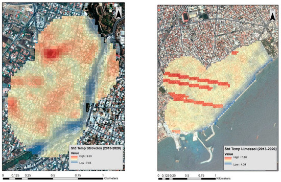 Figure 5 shows the standard deviation of the temperatures between the period 2013 to 2020 for both case studies. Standard deviation can be used to observe significant fluctuations of temperatures. Significant changes in the temperature are recorded in the Strovolos case study (Figure 5, left), following a similar pattern with the mean temperature outcomes (Figure 4, left). These fluctuations are within a range of two Kelvin degrees. In contrast, fewer fluctuations are observed in the Limassol area from 2013 to 2020 (Figure 5, right). The red lines in Figure 5 (right) are due to missing data from the Landsat 7 sensor [21].