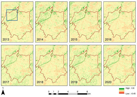 where, refers to the reflectance value at the near-infrared part of the spectrum, refers to the reflectance value at the red part of the spectrum, and refers to the short-wave infrared reflectance value at the near-infrared part of the spectrum. Based on the obtained NDVI and NDBI indices for the areas under examination, time-series annual maps, starting from 2013 until 2020, were created. These maps were used for a diachronic interpretation and evaluation of the changes that occurred in the landscape of the two testbeds.