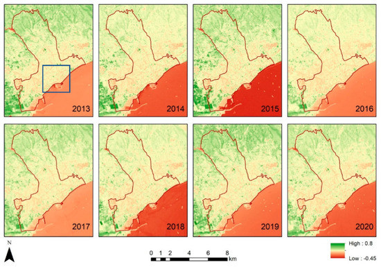 Using the optical bands of the Landsat sensors, the NDVI index was calculated for each year starting from 2013 to 2020. This was carried out in the Google Earth Engine platform. Figure 6 shows the results for the Strovolos case study, while Figure 7 the NDVI results of the Limassol area. The area under investigation of the previous section is shown with a blue rectangle in Figure 6 and Figure 7. Higher NDVI values close to 1 indicate areas covered with healthy vegetation, whereas areas with NDVI values, less than 0.20, indicate non-vegetated areas. Vegetated areas are highlighted with green colour compared to the rest areas shown in yellow and red.