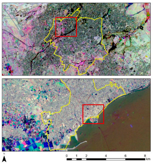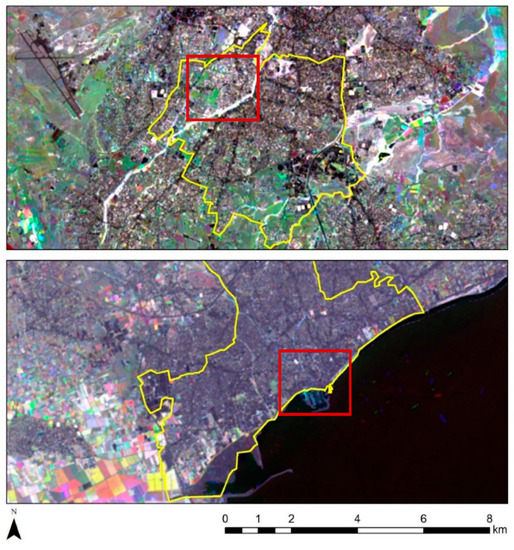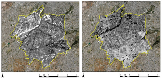 Figure 12 (bottom) shows that the NDBI index has a good correlation with the area’s thermal response. Indeed, the red hotspots, which are visible in Figure 12 bottom, and which equal augmented building activity, are matching the red hotspots of Figure 12 top, which are the result of recorded high temperatures. The NDVI index tends to provide a “reverse” outcome. This is very important, as, in many satellite sensors, the thermal spectral band is missing. In contrast, the short-wave infrared, near-infrared and red spectral bands used for the calculation of the NDBI and NDVI are more frequently found in satellite sensors, even with higher spatial resolution.