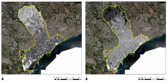 A similar approach was also followed for the Limassol case study. The results are shown in Figure 11 for the NDVI (left) and NDBI (right) indices. In this area, we can observe changes along the coastline. These are highlighted with white tones of grey. These changes should be linked with new constructions carried out in the last years at the seafront of the city, where sky-towers were constructed [22].