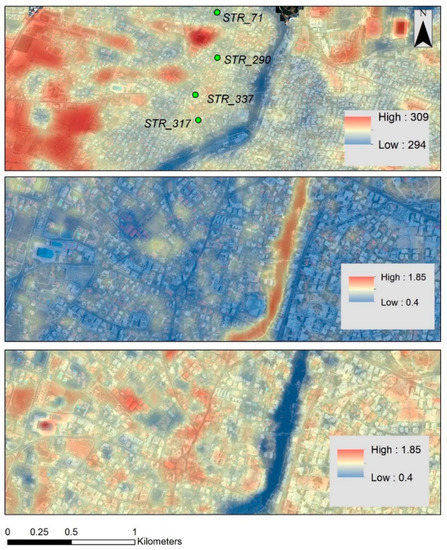 (Top) Mean thermal temperature over the Strovolos case study. (Middle) The PC1 analysis of the NDVI of the same area. (Bottom) The PC1 analysis of the NDBI of the same area (period 2013–2020). Selected historic buildings are shown on top (STR_XX).