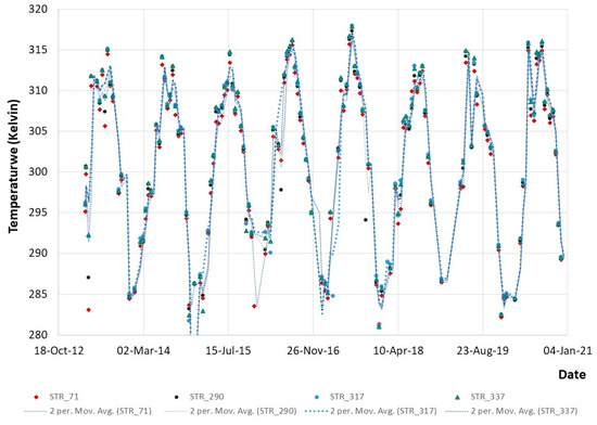 Temperature profile (in Kelvin) for four historic buildings: STR_71; STR_290; STR_317; and STR_337 (see Figure 12), as reported from the Google Earth Engine for the period 2013–2020.