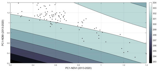 An empirical second-order polynomial equation was carried out for the given area (Figure 14). It was formulated using three input parameters: the mean temperature and the first principal component analysis (PC1) of the NDVI and the NDBI indices. The R-square was estimated to be 0.83, and the RMSE was found as 0.45. In detail, the coefficient of fitness was calculated as follow: SSE: 19.62; R-square: 0.8307; RMSE: 0.4568. The model is given in Equation (4) below: