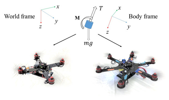 where m is the mass of vehicle; and are the position, velocity vectors and acceleration vector, respectively; T is the total thrust from the actuators and is the external disturbance term including aerodynamic drag force in flight. is the rotation matrix from the body frame to the inertia reference frame, and is the gravitational acceleration.