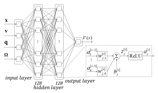 Value function using neural network approximation; the function consists of two hidden layers with 128 rectified linear unit nodes in each layer. The input is the state of vehicle, where and are the position, velocity, quaternion, and angular velocity, and the output is the estimated value of state .