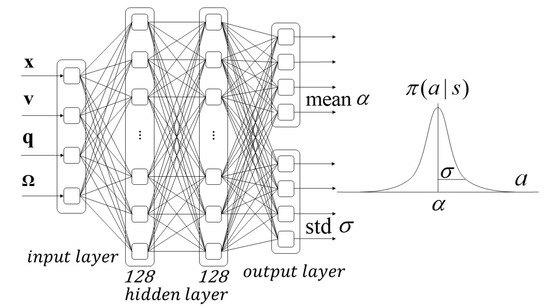 In this paper, we have two neural networks: one used for state value estimation and another for determining the actions, as illustrated in Figure 2 and Figure 3. The value function is used for neural network approximation; the function consists of two hidden layers with 128 nodes in hidden layer. Rectified linear unit activation function is used in hidden layer and output layer. The inputs of the function are the states of vehicle (position, velocity, quaternion, and angular velocity), and the output is the estimated value of state . The policy neural network approximation structure consists of two hidden layers with 32 rectified linear unit nodes in each layer. The policy neural network outputs the mean and standard deviation of the Gaussian distribution to generate the control command. The sinusoidal function is used as the activation function in the output layer to ensure the output is bounded, and scales are applied to delimit the desired acceleration range.