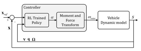 Multirotor vehicle controllers traditionally provide control on two levels. The high-level outer loop provides mission-level control, such as way-point navigation or trajectory planning and tracking. By contrast, the low-level inner loop ensures system stabilization and motion control. When using a control-theoretic-based method for stabilizing a multirotor, parameter tuning [1,2,3] or model identification has often been needed [4,5,6]. Such tuning requires some domain knowledge or the construction of precise kinematical and dynamical models by performing substantial setup and experiments for feedback linearization control [7,8], robust control [9,10], model predictive control [11,12], or sliding mode control (SMC) [13,14,15].
