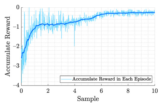 where , , and are the desired quaternion, desired position, and angular velocity, respectively, and to are the weights of these errors which are all set to . The quantities of and need greater than zero while the magnitude determines the priority of reducing position error and heading error. The number penalizes the angular velocity. A smaller implies a more aggressive control policy. We analyzed the necessity of different items in the RL training reward function (22) to simulate the flight performance of the quadrotor. We are interested in simpler reward function with fewer hyperparameters. The reward is normalized into to ensure convergence speed. The training takes approximately 10 million steps to train a control policy that achieves steady hovering at a designated position and the training curve of accumulate reward is shown in Figure 5. The training progress of the neural network navigates the vehicle to the designed target, and the accumulated rewards come to stable after around 70,000 episodes. In the following 30,000 episodes, the evaluation of reward does not show any significant progress, and the training can be stopped at this time. Figure 6 shows the block diagram of the training process. The are the data generated by the dynamic model which include the state of the dynamic model , action determined by the policy function, the policy probability , and the reward . The generated data are collected as the trajectory sample in the memory buffer and used in the optimization algorithm to update the weight of policy and value network .