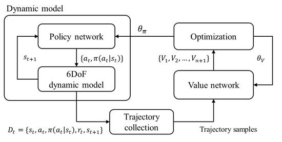 Block diagram of the training process. The are the data generated by the dynamic model which include the state of the dynamic model , action determined by the policy function, the policy probability , and the reward . The generated data are collected as the trajectory sample and used in the optimization algorithm.