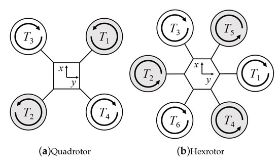 Top-down view of (a) quadrotor and (b) hexrotor models with propeller thrust pairs . Motors are indexed in the opposite direction starting from the motor, which generates thrust force .