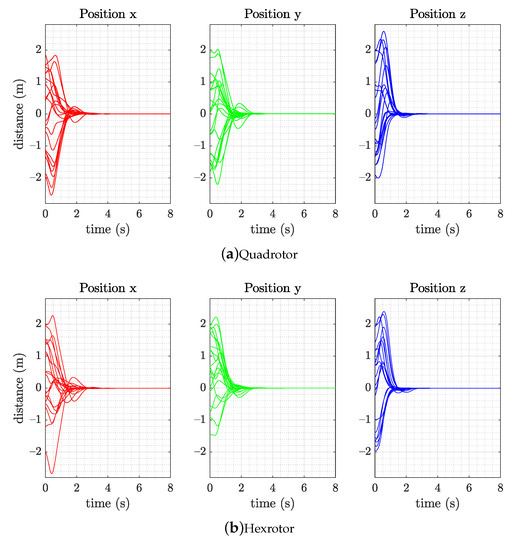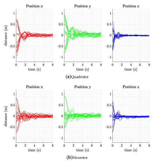 Experimental result of the (a) quadrotor and (b) hexrotor models, which achieved hovering capability within 8 s with 20 random initial states in the simulation flight test (position, velocity, attitude, and angular velocity).