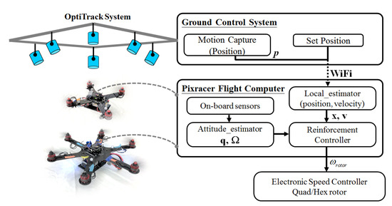 After the vehicle showed successful flight in the simulator, we transfer our algorithm to a real world flight test. In this test, our trained policy and control structure are implemented using a Pixracer flight control board (mRobotics, Chula Vista, CA, USA), which has an STM32F427 micro-controller clocking at 180 MHz and WiFi connection ability for wireless communication, enabling motion capture position feedback. The state estimation is performed using the on-board sensor and motion capture with extended Kalman filter. The on-board computation is conducted at 250 Hz, whereas the feedback from the OptiTrack motion capture system is provided at 120 Hz 3D precision in 0.5 mm. Consumer-grade standard parts (motors and propellers) are selected when building the multirotors. Each propeller can generate a maximum of 8 N. A consumer-grade electronic speed controller (ESC) mapping function of speed command to rotor thrust is built through experiment measurement. Figure 9 shows the system diagram used for the experiments. The p denote the desired goal, is the estimated position and velocity from local estimator. Quaternion , and angular velocity in body frame represent measurements from flight controller on-board sensors. is thrust force in newton and rotor speed in rad/s.
