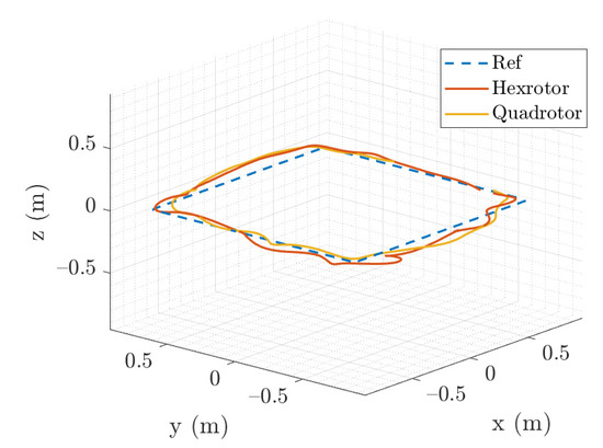 The quadrotor and hexrotor track a 1.5-m-wide square path with waypoint moving in 0.3 m/s.