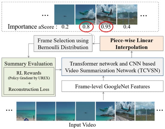 The policy gradient method is a popular and powerful policy-based reinforcement learning method [,,,]. It optimizes the parameterized policy using the reward (cumulative reward in an episode) by a gradient descent method, such as SGD []. The policy gradient method, especially, operates by increasing the maximized log probabilities of the actions and reward from the action generated by the policy []. However, the policy gradient method has several problems, such as the low sample efficiency problem []. It means that the agent requires many more samples (experience), for learning actions in the environment (states), than humans. Another problem is the high variance of the estimated gradient. This problem is caused by the high dimensional action space and long-horizon problem [], which means a hugely delayed reward for a long sequence of decisions to find a goal. In our proposed method, we present the piecewise linear interpolation-based video summarization method to reduce variance with the effect of reducing action space.