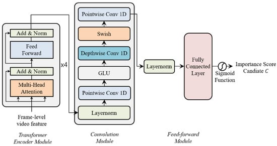 We propose Transformer network and CNN based video summarization network (TCVSN) to increase video summarization performance as shown in Figure 3 which is composed of a transformer encoder module, convolution module, and feed-forward module. Our network is motivated by the Conformer network []. The Conformer network was proposed for audio speech recognition (ASR). The main idea of the Conformer network is that the transformer network captures the global context of the audio sequence and the convolutional neural network (CNN) captures local context. We follow this idea in this paper, but we changed and simplify network architecture. We use the original transformer encoder network, proposed in [], to replace the multi-head self-attention module of the Conformer network. We adapt the convolution module of the Conformer network without batch normalization and dropout. We propose our network with shallow architecture without residual connections. Because we train the network with smaller datasets than the audio datasets. In the feed-forward module, we use layer normalization (LayerNorm) [] and a fully connected network with the sigmoid function to calculate the importance score candidate C. Especially in our network, key properties (re-scaling, re-centering) of layer normalization are very important to distribute the importance score candidate values evenly. Because without layer normalization, the importance score candidate values tend to be concentrated in the middle (0.5) after the sigmoid function. Therefore, we can learn the representation of the video and visual differences among the frames in the video with our proposed network, which has hidden states . The output of the network is the importance score candidate to be interpolated to importance score which is the frame-selection probability to select frames as a video summary. We choose the last time step sequence within I length of the output. Then, by using the fully connected (FC) layer and sigmoid function, we change the output, which is multi-dimension features to the 0 to 1 probabilities of the importance score candidate.