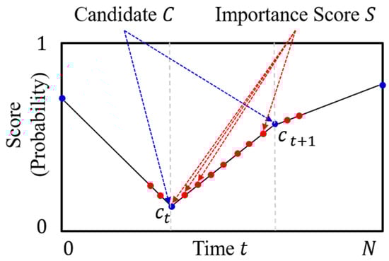 Interpolation is a type of estimation method that guesses the new data points within the range of the known discrete data point. We first align the importance score candidate to fit the input size N of the frame sequence at equal intervals. We interpolate the candidate () to the importance score () using piecewise linear interpolation, as shown in Figure 4. Piecewise linear interpolation connects the importance score candidate with the linear line and calculates intermediate values on the line []. After interpolation, we find the importance scores of each frame of the video, which is the frame-selection probabilities.