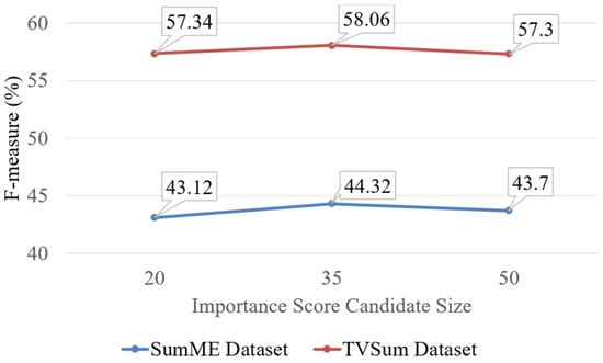 Average result (%) for different importance score candidate sizes (20, 35, 50) to be interpolated to importance score on SumMe and TVSum dataset.