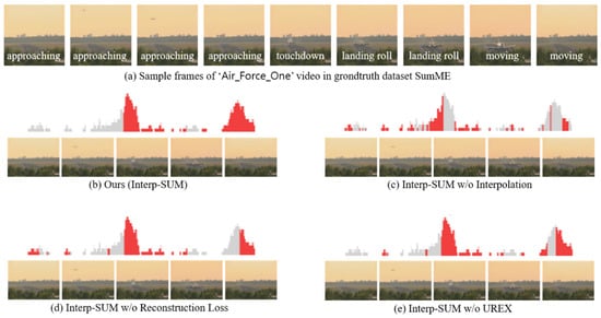 We visualize the qualitative results of different variants of our method with example images. Figure 6 presents sample frames with summary scores for different variants of our method. The gray bars are the ground truth summary importance scores. Red bars are the top 1/3 of generated importance scores by different variants of our approach. As presented in Figure 6b, Interp-SUM enables selecting adjacent frames of a keyframe predicted by a high score. Because scores of the neighboring frames are similar. This is an advantage of the interpolation method to retain relations between neighboring frames while training for selecting keyframes. Based on the interpolation method, the network generates a more natural sequence of summary frames than the network without the interpolation method, and the keyframes in the main content are selected. As presented in Figure 6c, when we do not use a piecewise linear interpolation method, it is even difficult to select the surrounding frames of the keyframe that has high importance score. Because the importance scores of the near frames directly generated from the network are not as similar as interpolated importance scores of the near frames. It means that the near frames are not selected often without interpolation. In the case of Interp-SUM without reconstruction loss, as shown in Figure 6d, we think that, since only reward function for learning representativeness of the video is not enough to train network, the frames with higher importance scores are less selected such as landing roll or moving. Interp-SUM without UREX, as shown in Figure 6e, shows almost the same performance as Interp-SUM, but as you can see, the last few important frames (moving) are not selected. We think that the result of Interp-SUM without UREX indicates that the UREX algorithm is also important to improve video summarization performance.