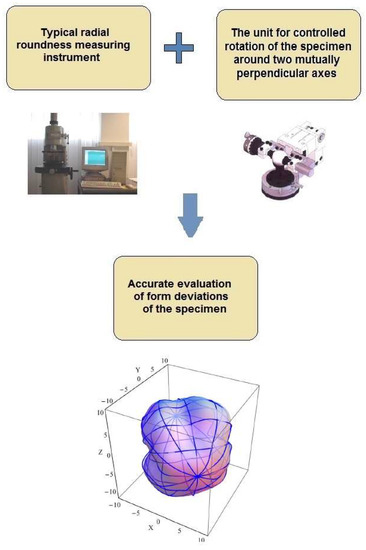 The concept of using a typical radius-change instrument to measure sphericity deviations of machine parts was as follows: A typical radius-change measuring instruments commonly applied in the bearing industry, for example, Talyrond 73, was used. Additionally, we equipped the measuring instrument with the unit allowing precise controlled rotation of the sphere. With this unit, we could perform roundness measurements in clearly defined cross-sections of the measured parts. After a series of measurements, we sent the measurement data to the software that combined the measured 2D profiles into a 3D model of the part. The concept is presented in Figure 1.