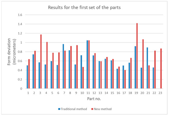 Comparison of form deviations obtained by the traditional and by the new method for the first set of parts.