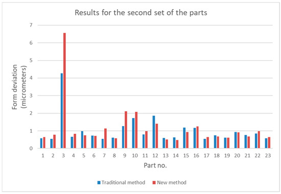 Comparison of form deviations obtained by the traditional and by the new method for the second set of parts.