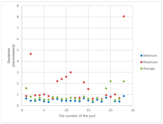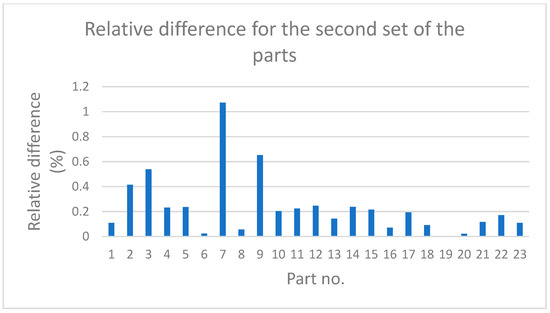Figure 6 and Figure 7 show the values of relative differences calculated according to Equation (5) for both sets of parts.
