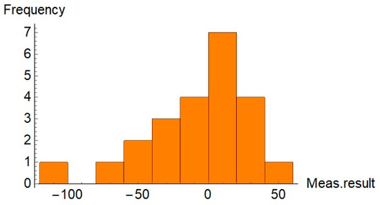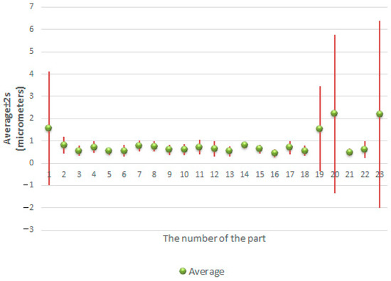 As shown, the experimental value of t calculated with the use of Equation (6) () did not exceed the critical value . Thus, the test indicates that the difference between mean values of the relative difference for both sets of the parts is not statistically significant.