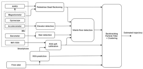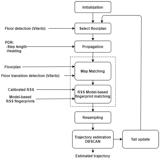 Figure 4 shows a high-level flowgraph of the BPF algorithm. The input for this algorithm is the output of all other parts of the system, i.e., PDR, floor plans, WiFi RSS fingerprinting, floor number detection and floor transition detection. Specific design choices are described here. For more details on BPF and PF in general, see [,].