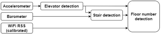 In the first phase, the accelerometer data were used to detect elevator usage. In the second phase, barometer data were used to detect stairs usage, while the (absence of) elevator detections was used to ignore noisy barometer data and prevent confusion between elevator and stairs detections. In the third and final phase, the output of the previous phases was fused with RSS fingerprinting by a Viterbi-based algorithm to detect the correct floor number.