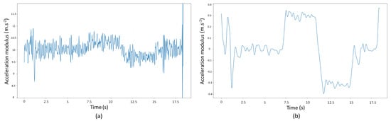 Acceleration modulus while the pedestrian is taking an elevator. Before (a) and after (b) filtering with the Gaussian low-pass filter and removal of the gravity component.