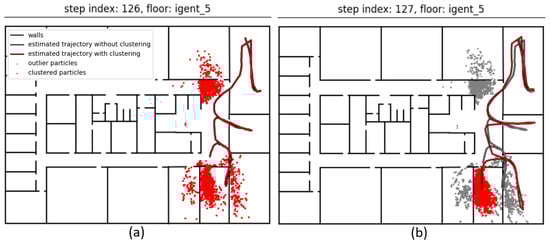 The BPF updated the previous positions by recursively calculating the centroid of the predecessors of only the cluster’s particles. This allowed the BPF to recover when the wrong cluster was chosen and was removed during subsequent map matching steps. In that case, another cluster would be chosen, and the previous positions could be corrected by backtracking. This is illustrated in Figure 5. Multiple clusters were found (Figure 5a), but none of them were significantly heavier than all other clusters. No particular cluster was selected; thus, the position (and the entire trajectory) was estimated using all particles. One step later (Figure 5b), the weight of the correct cluster increased and now exceeded the weight threshold. Only the clustered (red) particles were now used for calculating the new position and backtracking the previous states, resulting in the red trajectory. The other (grey) particles were considered to be outliers. The grey trajectory was estimated by backtracking with all particles. Note that the outlier particles were not deleted. Instead, all particles that were chosen during the resampling step were used in the next filtering cycle to prevent sample impoverishment.