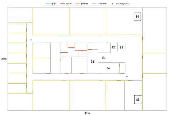 The considered environment consisted of seven 41 m × 27 m (1107 m) floors in an office building. Figure 6 shows a floor plan of the 5th floor of this building, where most of the measurements were performed. The office floor has three elevators (Es), four staircases (Ss) and two WiFi APs. Figure 7a shows one of the two centre staircases. These are located in separated stairwells and connect to all other floors of the twelve-storey building. Figure 7b shows one of the metal open spiral staircases, each of which connect the kitchens of two floors. is indicated by dashed lines because the staircase is only present at Floors 9–12, while is present at Floors 3–8. Figure 7c shows the three elevators. The APs are indicated with blue dots. Note that the centre of the floor consists of thick concrete walls, where the smartphones often cannot detect the APs’ signals. The floor height is m. Plots of the other floors were omitted because they are almost identical. For example, each floor has two APs, but sometimes in a different corner of the hallways. The path loss model of Section 3.2 incorporated all elements of Figure 6, except for the open staircase (S3), when predicting the RSS fingerprints for the fifth floor.