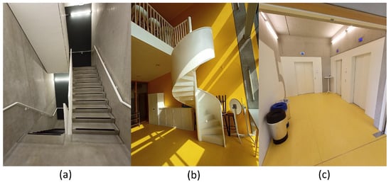 Pictures of one of the staircases in separate stairwells (a), the open staircase in the kitchen (b) and elevators (c).