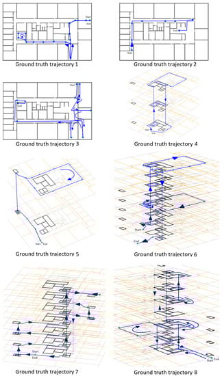 Eight trajectories were travelled for the evaluation. Figure 8 shows the evaluation points of each trajectory. These trajectories had a combined length of 1230 m and consisted of a total of 160 known points and 19 floor transition events. We recorded a total of almost two hours (116 min) of data for the evaluation. The first trajectory was performed once by four persons, and all other trajectories were performed four times by one person, which resulted in a total travelled distance of km and 76 floor transition events. The first three trajectories were entirely on the fifth floor, while the others were multifloor trajectories. In total, there were 12.6 min spent using the elevator and 23 min spent climbing the stairs. The remaining 81 min were spent roaming through the building, mostly on the fifth floor. More information for each trajectory is provided in Table 2.