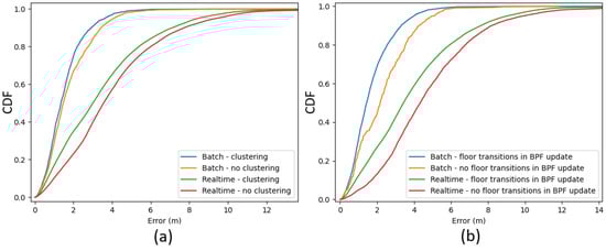 The accuracy of the BPF with DBSCAN clustering was compared to the default BPF, while the Viterbi-based floor detection algorithm was compared to the conventional approach: pure RSS matching using the Euclidean distance metric. Furthermore, to assess the contribution of fusing the RSS with transition detection, the algorithm was also tested without incorporating the transition detections. Lastly, both the BPF and floor detection algorithms could correct previous estimations based on new information and were therefore evaluated in real-time and batch mode.