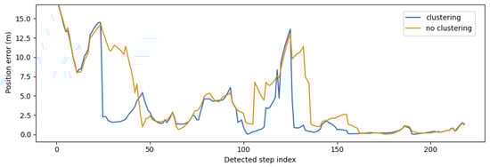 As mentioned before, multiple physically valid solutions are possible depending on the travelled trajectory, the geometry of the building, the amount of APs available for fingerprinting, etc. This leads to multimodal state distributions, i.e., the particles are gathered in different clusters. This happens especially when no constraints on initial position and/or heading are applied [], as was the case in our system. Simply using the centroid of the particles causes large errors. Therefore, DBSCAN [] was proposed to recognize the largest cluster of a particle set. The motivation for using DBSCAN was that the amount of clusters can change and must be detected automatically. Since the walls were used to remove impossible particles, the clusters can be arbitrarily shaped. DBSCAN can handle both situations and can also detect outliers by excluding them from any cluster. All obtained clusters were refined by removing the particles that had a wall between them and the cluster centroid. The removed particles were annexed to a new cluster. The position was finally estimated by calculating the weighted centroid of the largest cluster if its weight was at least larger than the second “heaviest” cluster. If only one cluster was found, it had to contain at least a third of all particles. In all other cases, the position was estimated as the weighted centroid of all particles. While these parameters were not very sensitive, choosing much lower values increased the chance of choosing the wrong cluster because the correct cluster was not always the largest. Especially if the PDR output was noisy, the correct cluster would often remain small until particles of other clusters started to disappear because of wall collisions.