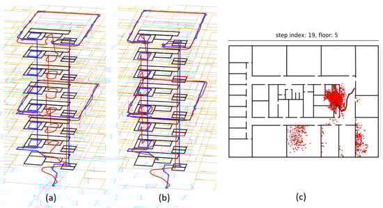 Propagation of the i-th particle was performed by calculating the position of each new particle based on the location, inherited biases and the current PDR output. Artificial Gaussian noise was added to the inherited heading bias to enable heading drift compensation. Although was added to to account for noise, was inherited without the noise, because a systematic step length error was assumed. The latter occurred due to badly tuned coefficients in the step length model. More details on the propagation model can be found in [,].