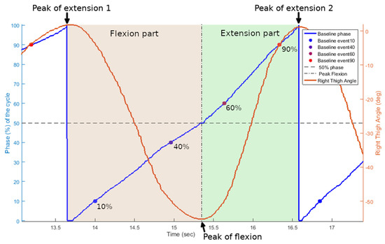 where is the desired detection phase in percentage, is the anticipated or last known range of motion, is the last peak of extension value in degrees, and is the resulting angle threshold for the event detection in degrees. In this case, for an offset of 10% around a peak (flexion or extension), when the input angle has a range of motion of around 40 degrees, an internal offset value of 3.82 degrees can be used to detect the desired thresholds within this study (i.e., 10%, 40%, 60% and 90% of the baseline).