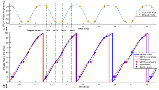 Representative data from subject 1 showing the right thigh angle on the top (a) and the phase estimations on the bottom (b). On the bottom graph, the blue line is the baseline reference, the red line is the GCI Observer output phase interpretation, and finally in purple, the Hilbert phase estimation. Corresponding events detected by the algorithms are shown superimposed on their respective line. Target events from the baseline in the second cycle are highlighted with vertical lines to help visual comparison with the corresponding event detections from the other algorithms.