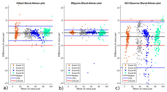 Non-parametric Bland–Altman results for the three algorithms. Presented from left to right, respectively: (a) Hilbert, (b) BSgonio, and (c) GCI. Event types (10, 40, 60, and 90%) are shown separately with dedicated colours. Upper and lower limits of agreement shown as blue lines; upper and lower accepted error margin criterion shown as red lines (±10%); median shown as black line; zero shown as a light grey line.