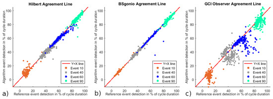 Reference event detections against Algorithm event detections for the three algorithms. The red line is the 45° line through the origin where Y = X corresponding to perfect agreement between the two methods. Presented from left to right: (a) Hilbert, (b) BSgonio, and (c) GCI Observer. Respective event types (10, 40, 60, and 90%) are shown separately with dedicated colours.