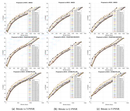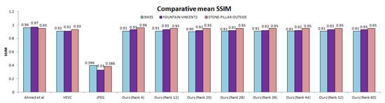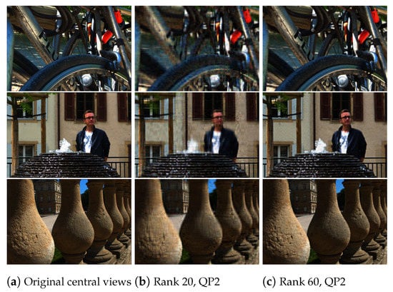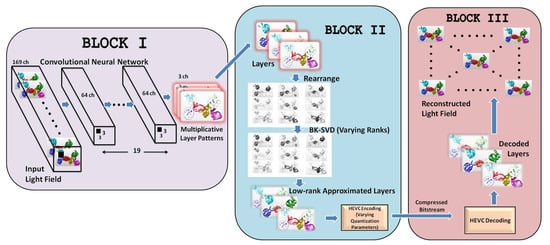 - The proposed scheme is flexible to realize a range of multiple bitrates within an integrated system trained using a single CNN by adjusting the ranks of BK-SVD representation and HEVC quantization parameters. This critical characteristic of the proposed scheme sets it apart from other existing light field coding methods, which train a system (or network) to support only specific bitrates during the compression. It can complement existing light-field coding schemes, which employ different networks to encode light field images at different bit rates.
