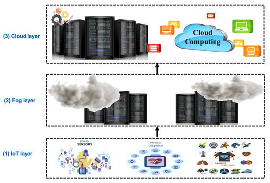 Recently, many medical devices are equipped with sensors to collect, communicate, and integrate the massive generated medical data. Modern healthcare systems are based on emerging technology such as Wireless Sensor Networks (WSN) and the Internet of Things (IoT). Moreover, there is a widespread deployment for smart mobility initiatives that increase the development of intelligent healthcare systems. The objective is to maximize the use of real-time data streaming out of various medical, sensory services. The IoT generates diverse and complex big healthcare data. This data poses many challenges to the storage and analysis infrastructure. The convergence of IoT and several fundamental technologies such as cloud computing has become necessary to address the aforementioned challenges []. As shown in Figure 1, IoT-based healthcare systems may deploy a wide range of computing technologies such as cloud, edge, and fog computing, as a virtual resource utilization infrastructure.
