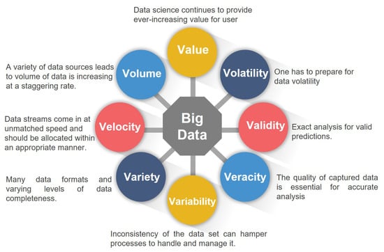 Big data has become a slogan for many scientific and technological enterprises, researchers, data analysts, and technical practitioners. Big data can be defined as any large and complex data source (gold mine) combined with a combination of old and new data-management technologies and architecture. Organizations can gather, store, manage, and manipulate extremely large volumes and a wide variety of data from many sources at the required speed and the proper time to gain the right insights []. Big data offers the basic functionalities that enable different organizations to manage data rapidly, timely conducted, and obtain smart decisions to gain the value of big data []. Big data is characterized by three V’s (Volume, Velocity, and Variety), according to industrial data analyst Doug Laney []. Three V’s are increased by four more V’s (Variability, Veracity, Validity, and Volatility) up to seven V’s later, as shown in Figure 2. To cope, the big biomedical data is characterized by scale, diversity, and complexity. Biomedical data processing consists of phases that are collecting, processing, and managing data. The main objective is to produce new information for end-users []. There are four steps for big data analysis, defined as four A’s: Acquisition, Assembly, Analyze, and Action.