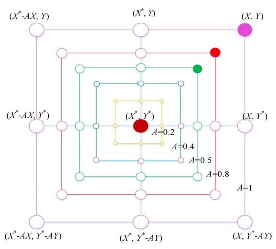 There are only two ways to simulate bubble-net behavior. The first is to shrink the enclosing using Equation (3) with a reduced range of A by a. The search agent’s new position can be defined anywhere between the best possible current position and the original position. Figure 3 depicts the feasible position from to that can obtain in a 2D space, as given by Equation (3). The second one is the spiral updating positions; Equation (5) is used as a logarithmic spiral equation. The movement of humpback whales around the prey is helix-shaped, which is mimicked using Equation (5).