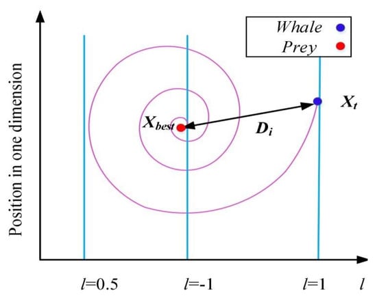 Here, is the distance from the ith whale to the victim, and B is a parameter for determining the form of the logarithmic spiral. l denotes a random number in that determines how close the next location of the whale is to the victim. is the nearest location to the victim as shown in Figure 4.