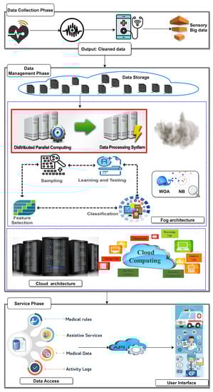 As shown in Figure 5, the block structure of the proposed Ambient Healthcare approach with the Hybrid Whale Optimization Algorithm and the Naïve Bayes Classifier (AHCA-WOANB) consists of three main phases, which are the data collection phase, data processing phase, and services layer. Based on fog computing, the AHCA-WOANB gains most of its benefits, including enhanced business agility, improved security, deeper privacy knowledge, and reduced cost of operation.